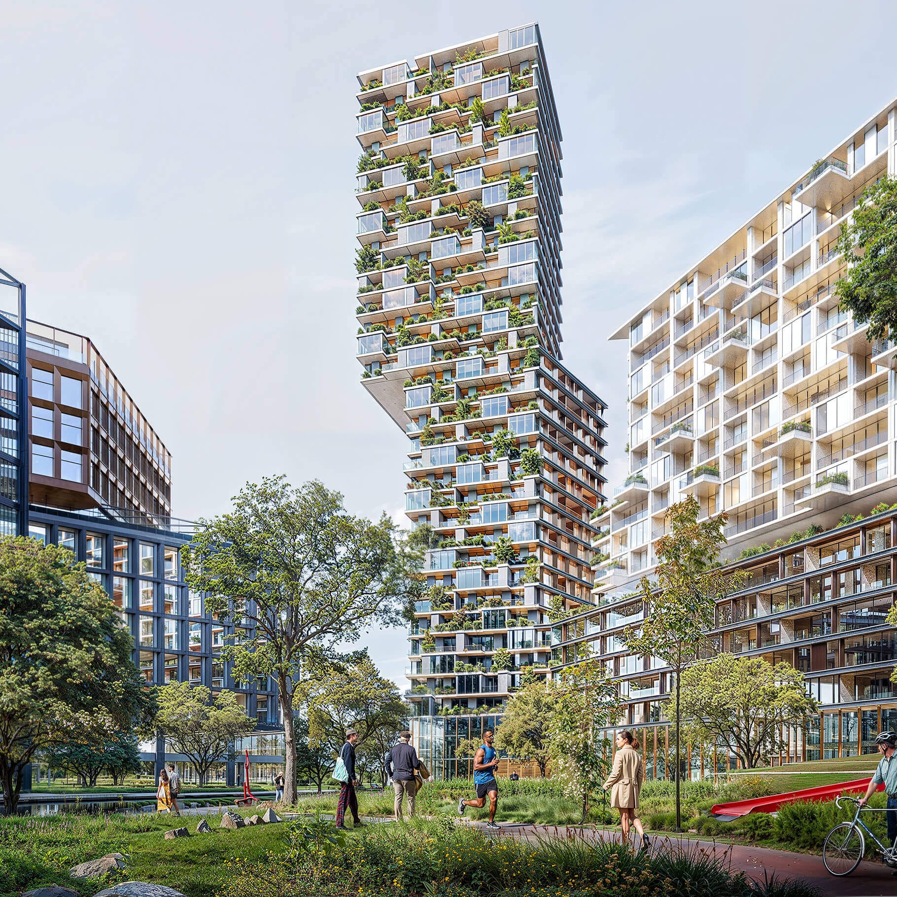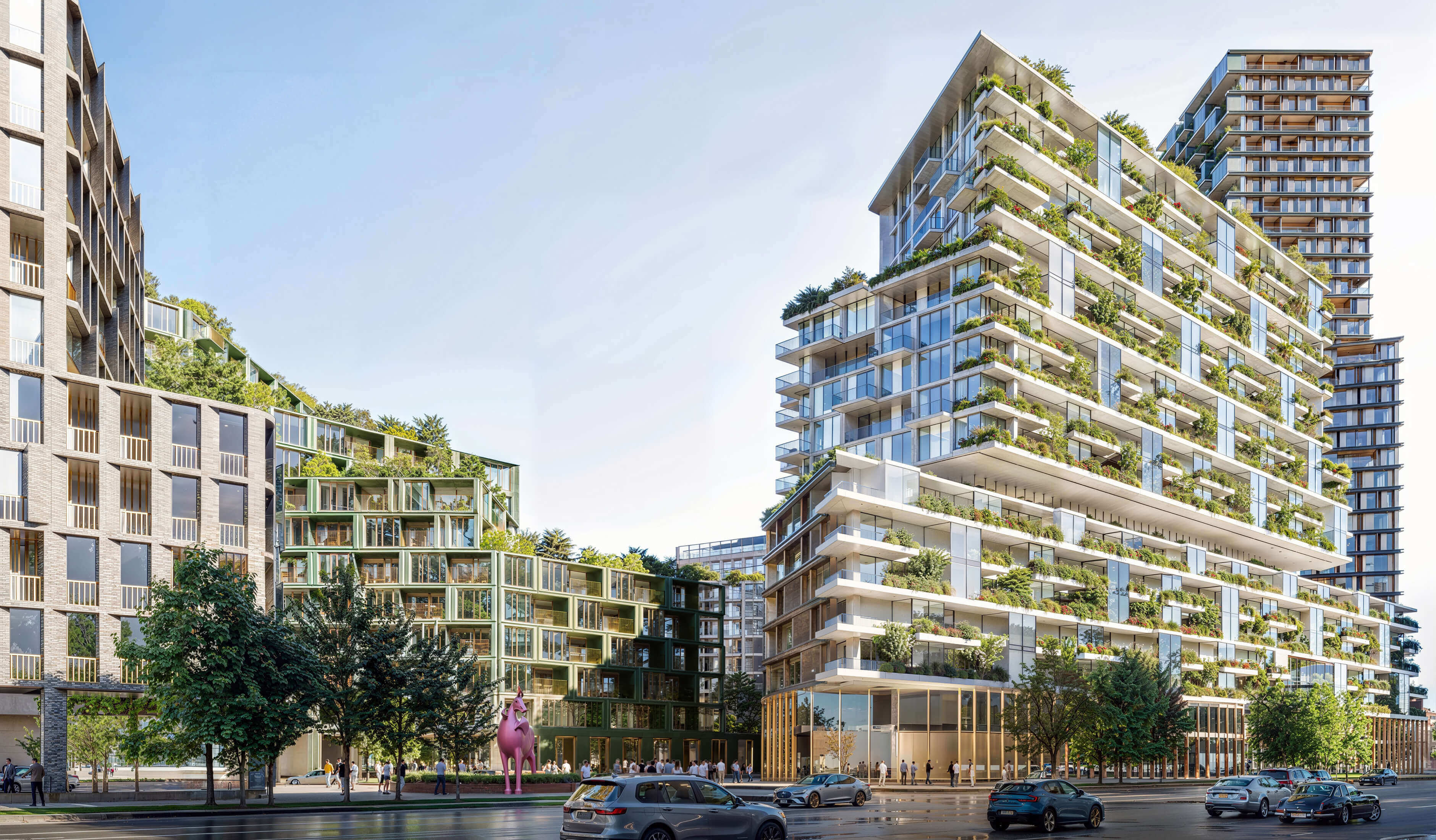 The project was conceived as an urban block with open public space, active ground floors, passages, and strong connections to nearby streets and the park.